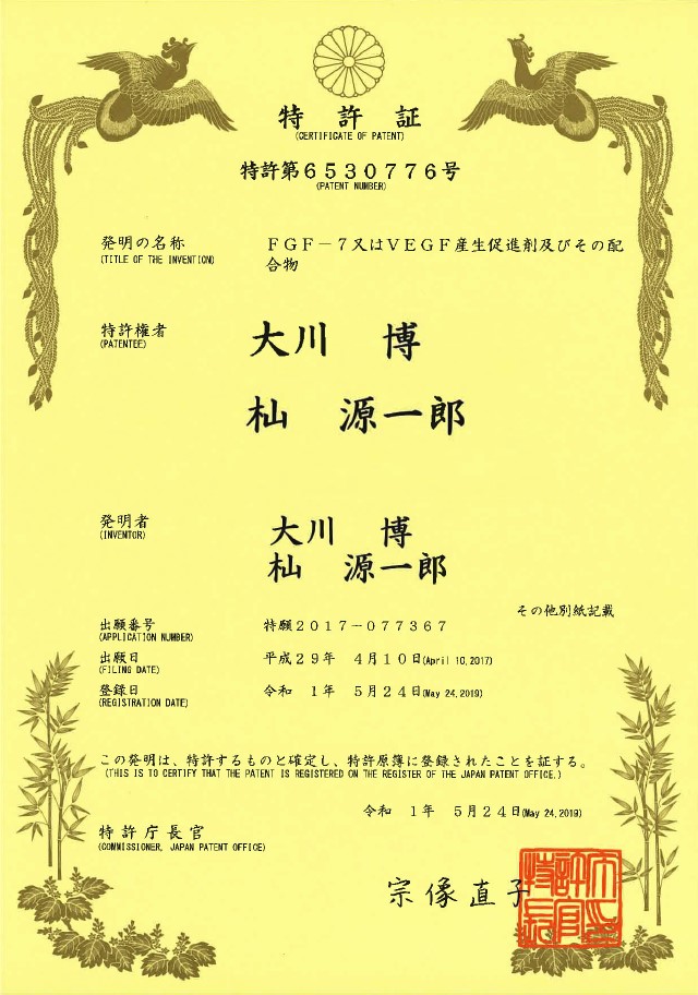 発毛メカニズム特許 発毛メカニズム特許 第6227594号 「FGF-7又はVEGF産生促進剤及びその配合物」 髪が育つのに必要な血管を作るタンパク質(VEGF)と髪に栄養を送るタンパク質(FGF-7)をつくることが証明されました。